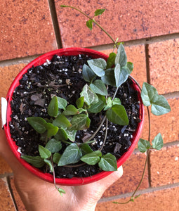 With spade shaped green leaves with white markings, this trailing perennial has tubular flowers which are off white and magenta.