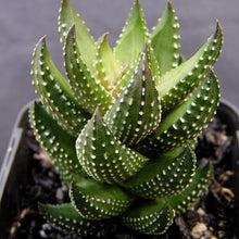 A slow growing clumping succulent with dark green leaves with white ribbing. The leaves turn pink when stressed.